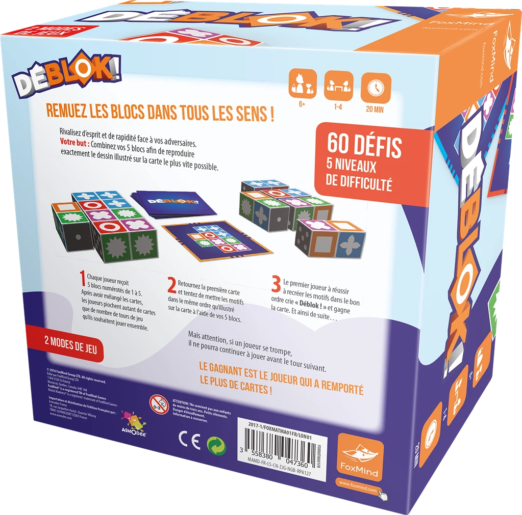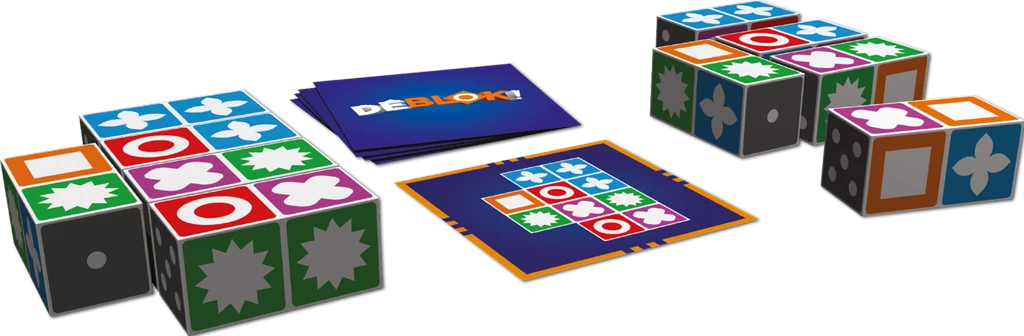 Déblok, c’est un savant mélange d’observation, de rapidité, de logique… Et de frénésie ! Chaque joueur dispose de 5 blocs qui comportent chacun 8 symboles. Une carte est retournée, qui comporte un schéma à reproduire le plus vite possible, avant de crier « Déblok ! ». S’il se trompe, il ne jouera pas le tour suivant. S’il a raison et que le schéma est respecté, il gagne la carte. Celui ou celle qui a le plus de cartes l’emporte.
