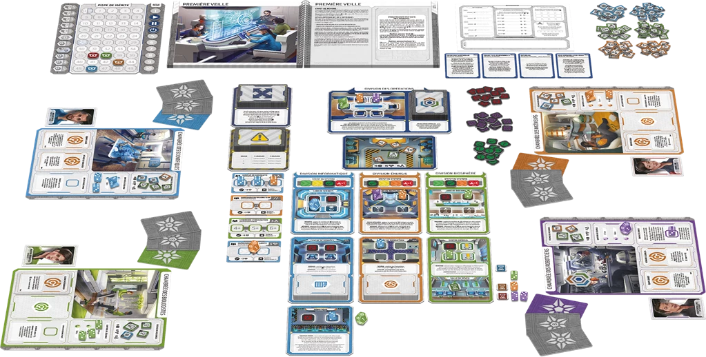 Contient de nombreuses cartes, des plateaux de Secteur, un plateau des Pistes, une fiche de chambrée, un journal de bord du vaisseau, plusieurs dés d’Équipage, des pions Ressource, un insigne, des marqueurs, un carnet d’intrigue, un livret de Règles et un Signet.