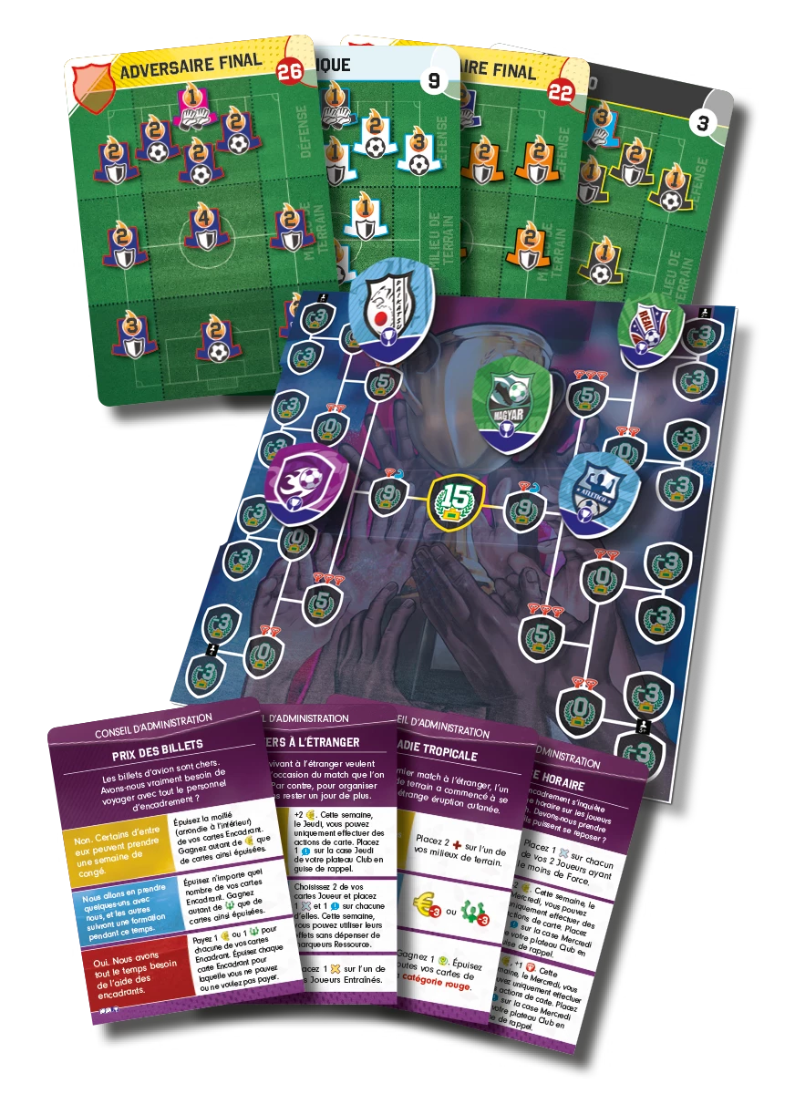 • Contenu : 42 cartes Adversaire, 4 cartes Adversaire final, 4 cartes Conseil d’Administration, 14 marqueurs Équipe adverse, 4 marqueurs Équipe, 1 plateau Coupe internationale et 1 livret de règles.