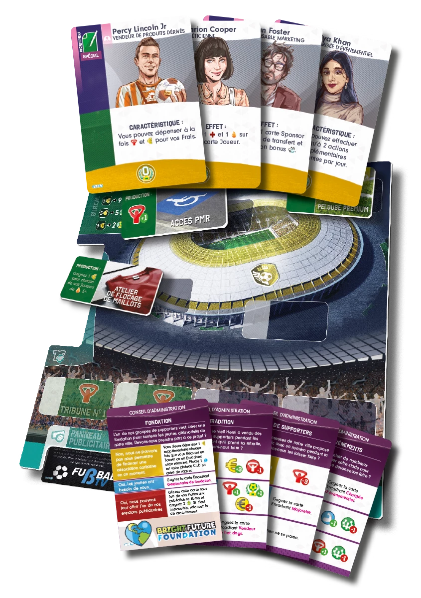 • Contenu : 5 cartes Objectif, 10 cartes Encadrant, 10 cartes Sponsor, 25 cartes Conseil d’Administration, 24 jetons Infrastructure de stade uniques et 1 livret de règles.