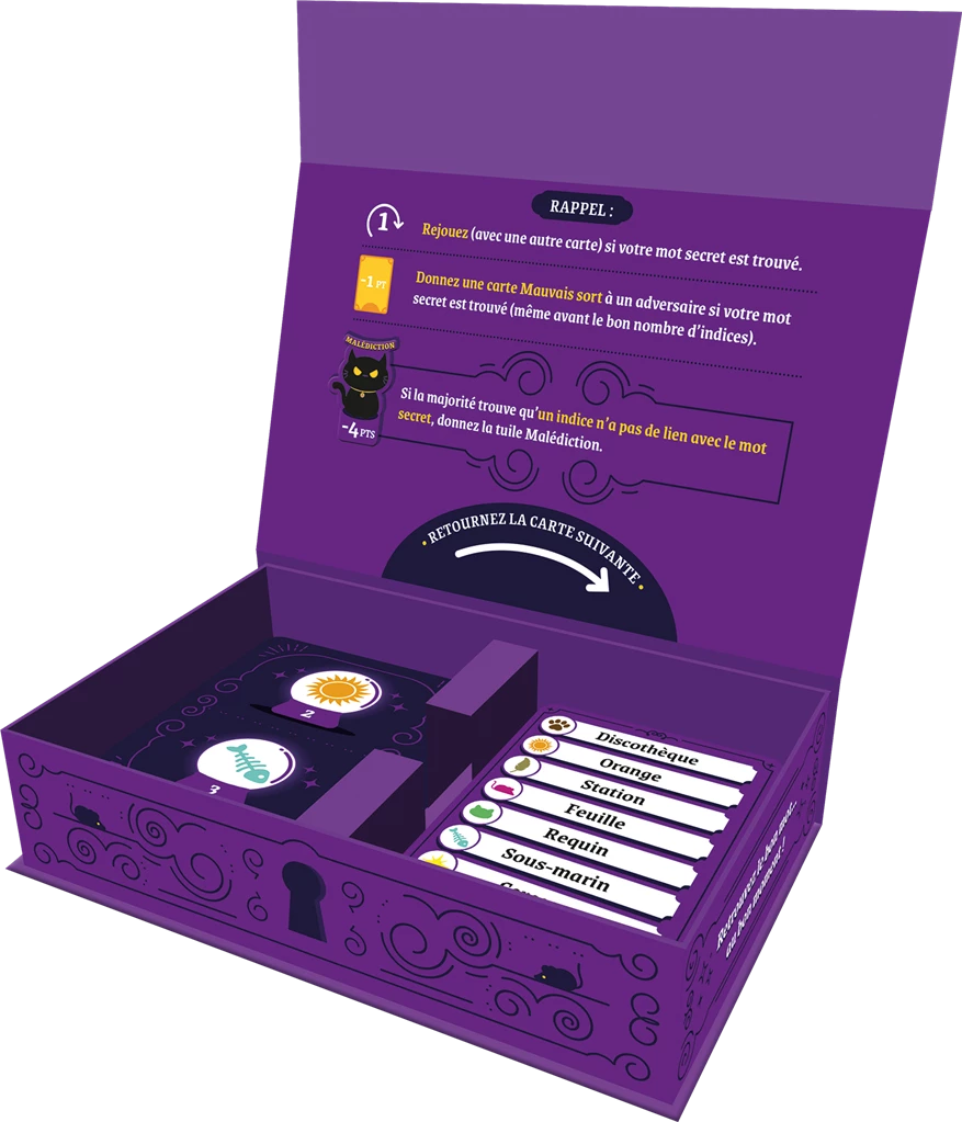 - Un joueur ouvre discrètement la boite et découvre un mot à faire deviner avec un nombre précis d’indices.