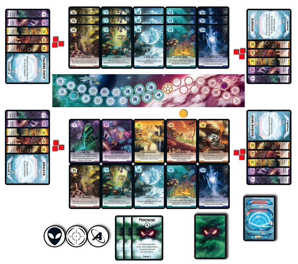 1 plateau, 55 cartes Lieu, 20 cartes Traque,