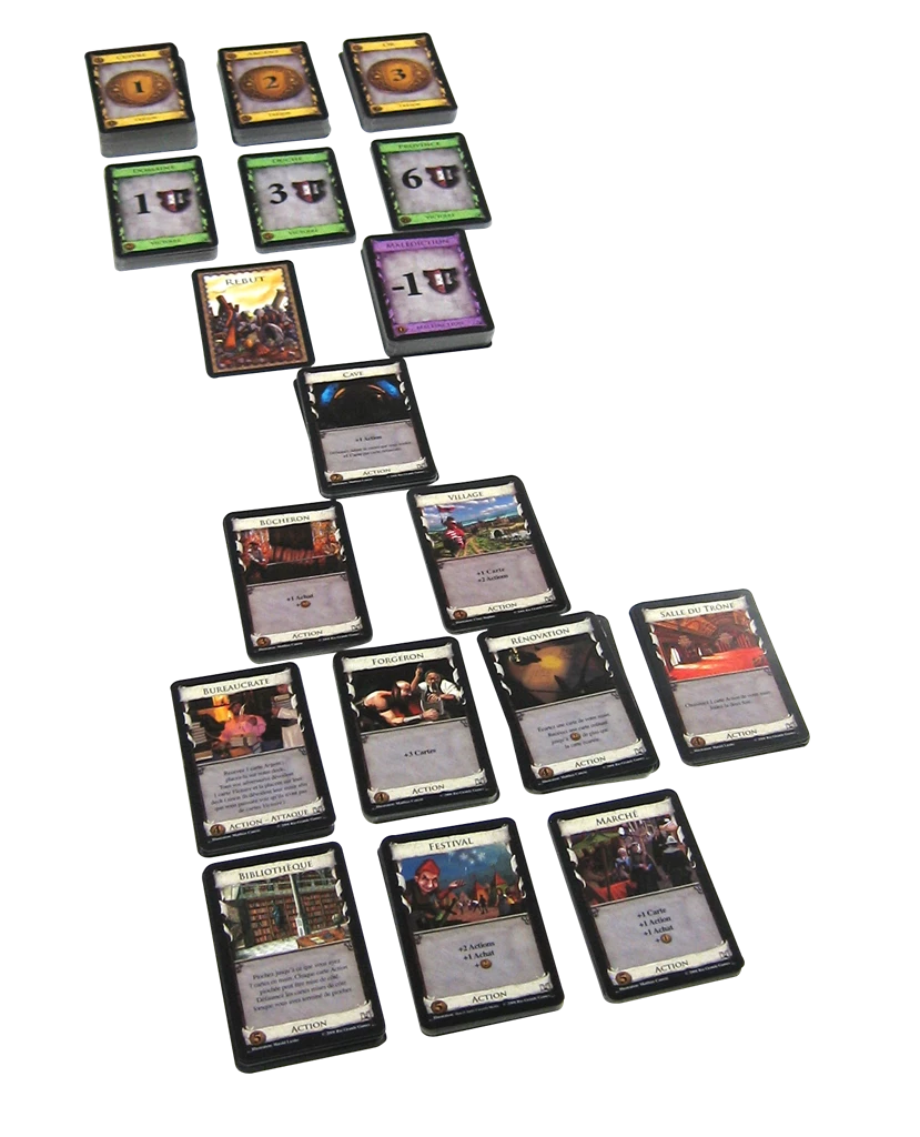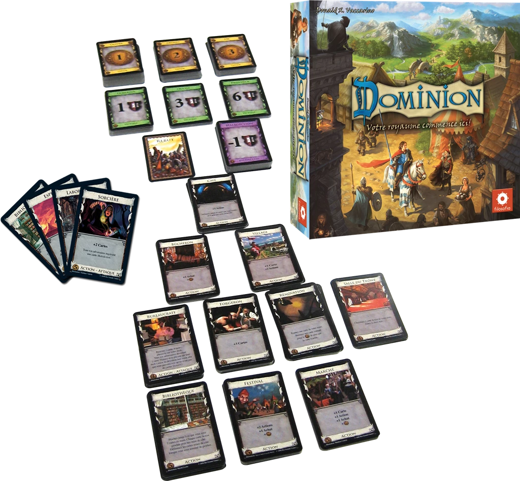 Étendez votre domaine ! Vous êtes le souverain d’un paisible royaume verdoyant. Vous rêvez d’étendre ce royaume et de le rendre plus grand et plus riche. Il vous faut un véritable Dominion ! En unifiant sous votre bannière les nombreux fiefs au bord de l’anarchie qui vous entourent, vous leur apporterez paix et civilisation. Mais d’autres monarques partagent vos ambitions. Vous devrez agir promptement afin d’acquérir le plus de terres possible !