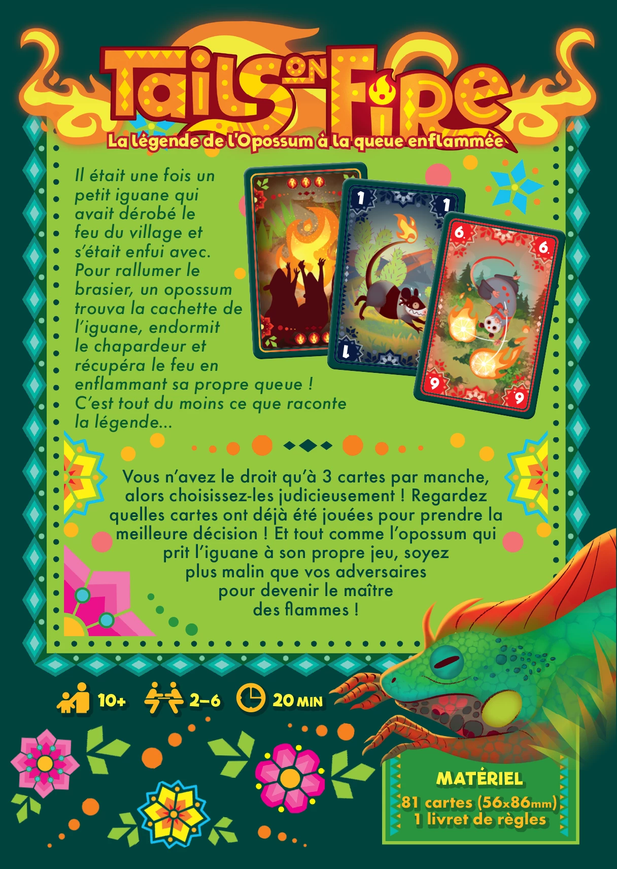 Au dĂ©but de chaque tour, sĂ©lectionnez soigneusement 3 cartes parmi un choix allant jusqu’Ă 10. Votre objectif ? Jouer une carte qui dĂ©passe d’un point la dernière carte jouĂ©e, ou faire le choix tactique de passer votre tour. Si la pile de jeu indique toujours votre carte lorsque votre tour revient, c’est jackpot ! Vous empochez une carte de feu, ces prĂ©cieuses Ă©tincelles qui vous rapprochent de la victoire. Et ce n’est pas tout : parfois, vous aurez l’opportunitĂ© de dĂ©rober des cartes de feu Ă vos adversaires !